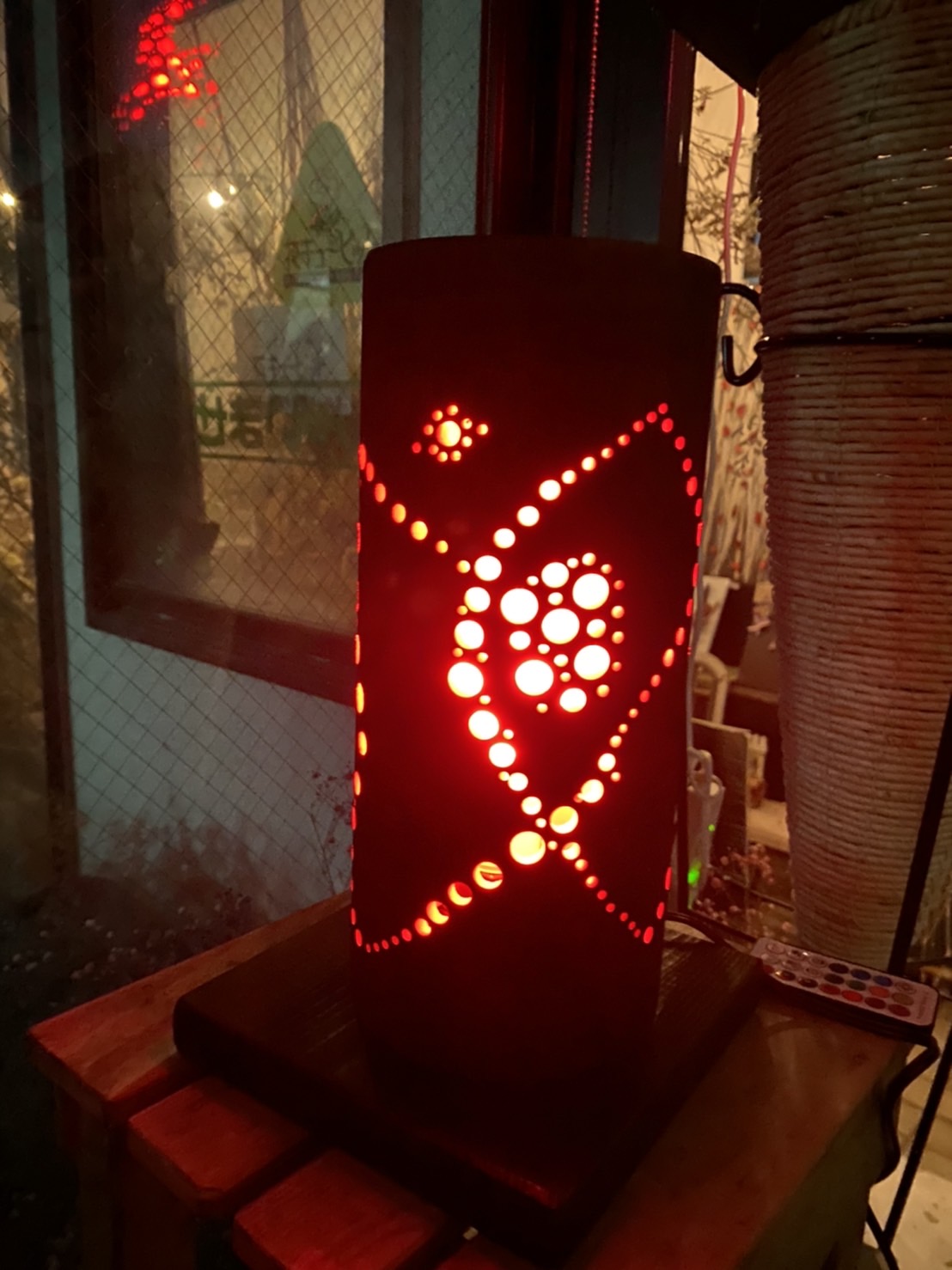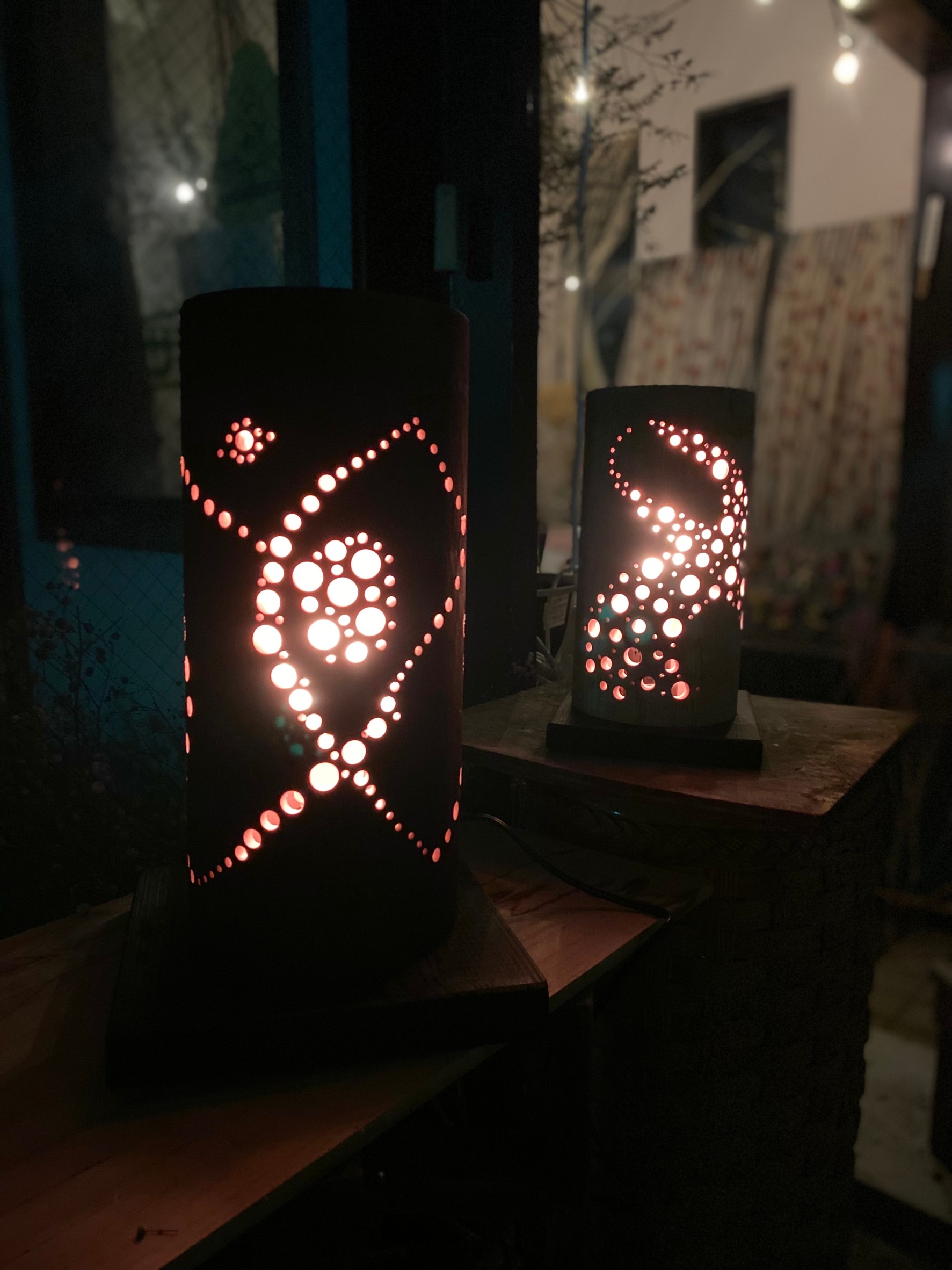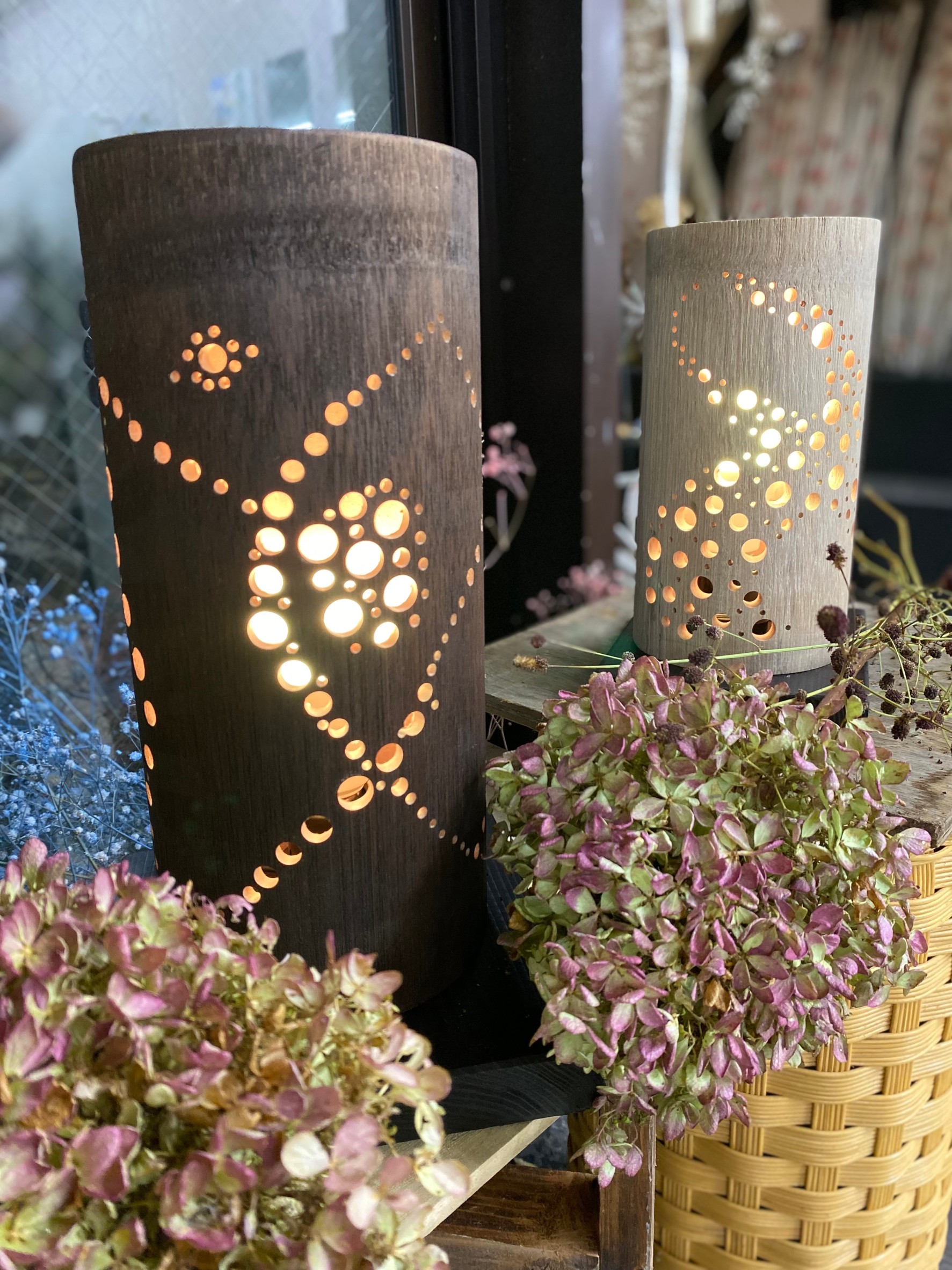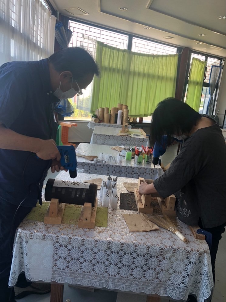 竹の側面に電動ドリルで大小の穴を開けていきます。